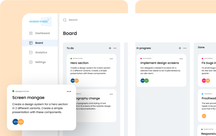 Our mission at Signage Studio is to provide cutting-edge digital signage solutions that empower our clients to connect with their audience in powerful ways. We are committed to delivering intuitive, feature-rich software that simplifies content management, enhances creativity, and maximizes the impact of every message. By offering exceptional customer support and fostering innovation, we aim to be the trusted partner our clients rely on to elevate their communication strategies and achieve their goals.